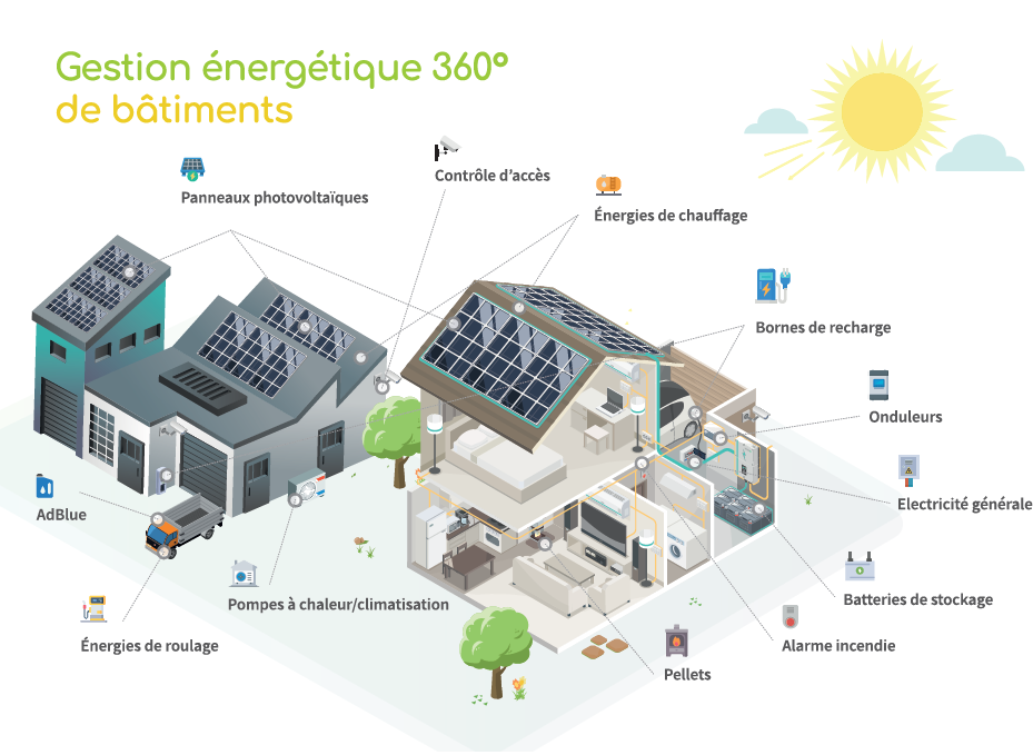 L’image met en avant une gestion énergétique complète et intelligente des bâtiments, bien au-delà des panneaux solaires. Easy Energy propose une approche 360°, intégrant :